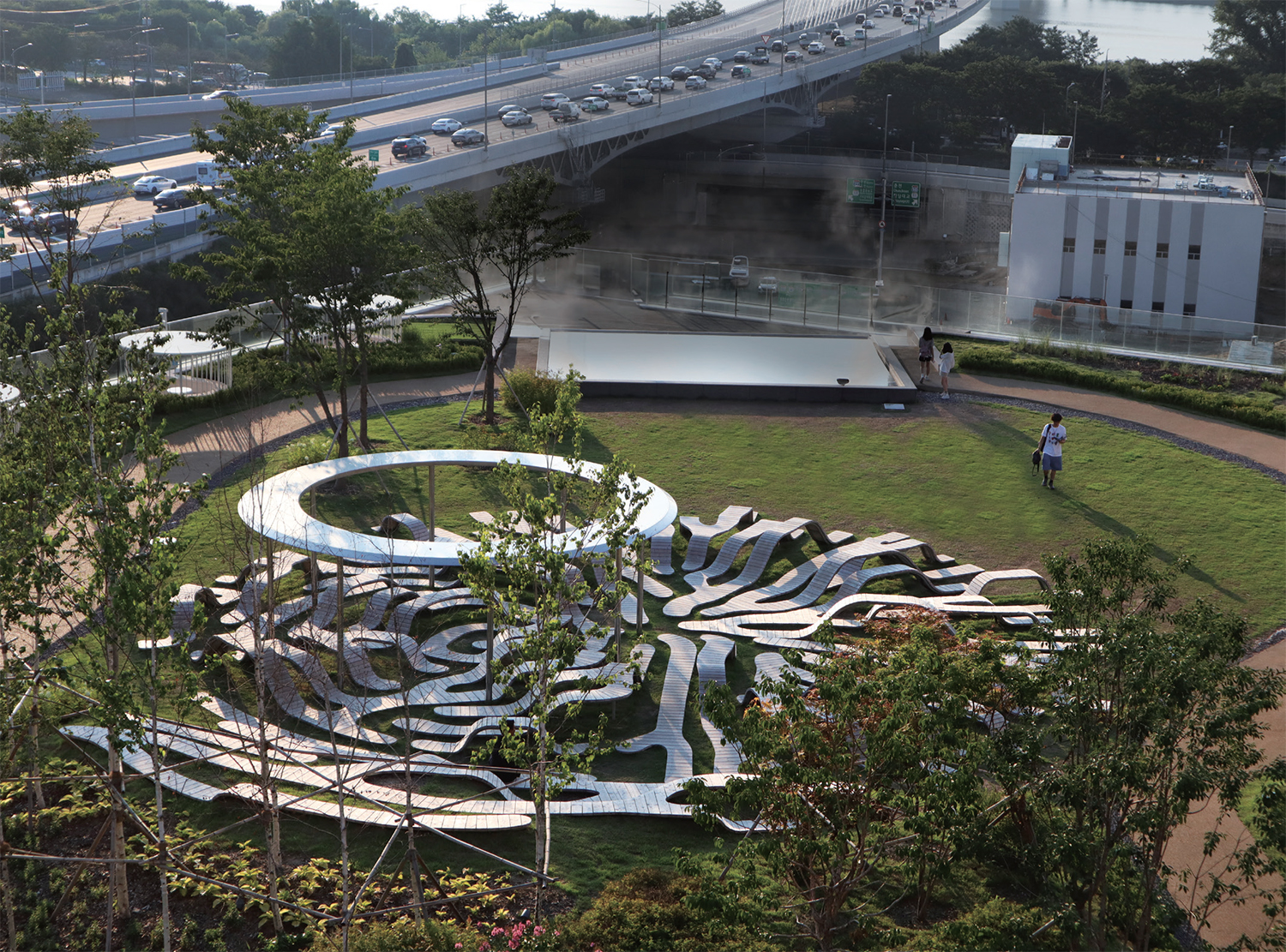 µµ½ÉÀÇ ¿Á»óÁ¤¿ø¿¡ ¼³Ä¡µÈ ´ëÇü °ø°ø °¡±¸ÀÎ °¥·¡¸¶´ç(2025)Àº Á߽ɿ¡¼ºÎÅÍ ºÐÈÇϸç È®»êµÇ´Â °î¼±Àû ±¸Á¶·Î, °ø°ø °ø°£¿¡¼ÀÇ »õ·Î¿î ÆÐÅÏ ½ÇÇèÀÌ´Ù. Áß½ÉÀÇ ¿øÇü ±¸Á¶¹°Àº Á߽ɼºÀ» °Á¶ÇÏ´Â ÀåÄ¡·Î ±â´ÉÇϸç, ±×°÷¿¡¼ ºÐÈµÈ °î¼±µéÀº ÀÏÁ¤ÇÑ ±ÔÄ¢ ¼Ó¿¡¼ º¯ÁÖÇϸç È®ÀåµÈ´Ù. ÀÌ·¯ÇÑ °î¼± ÆÐÅÏÀº ¿µ±¹ ¼öÇÐÀÚ ¾Ù·± Æ©¸µÀÌ Á¦½ÃÇÑ ¹ÝÀÀ-È®»ê°è(reaction–diffusion system)¸¦ ±â¹ÝÀ¸·Î ÇÑ´Ù. °£´ÜÇÑ ÈÇйÝÀÀ°ú È®»ê °úÁ¤ÀÇ °áÇÕÀ» ¼öÇÐÀûÀ¸·Î ¸ðµ¨¸µÇÑ ÀÌ ÀÌ·ÐÀº µ¿¹°ÀÇ ¹«´Ì³ª ½Ä¹°ÀÇ ¼ºÀå ÆÐÅÏó·³ Áú¼ ÀÖ´Â ÇüŰ¡ ÀÚ¹ßÀûÀ¸·Î Çü¼ºµÇ´Â ¿ø¸®¸¦ ¼³¸íÇÑ´Ù. °¥·¡¸¶´çÀº ÀÌ·¯ÇÑ ¿ø¸®¸¦ ¾Ë°í¸®ÁòÀ¸·Î º¯È¯ÇØ °î¼±ÀÇ È帧°ú °£°Ý, ³ô³·À̸¦ Á¶À²ÇÔÀ¸·Î½á, ÀÓÀÇÀû Á¶ÇüÀÌ ¾Æ´Ï¶ó ÀÚ±âÁ¶Á÷ÈÀÇ »ê¹°À» Á¦½ÃÇÑ´Ù.