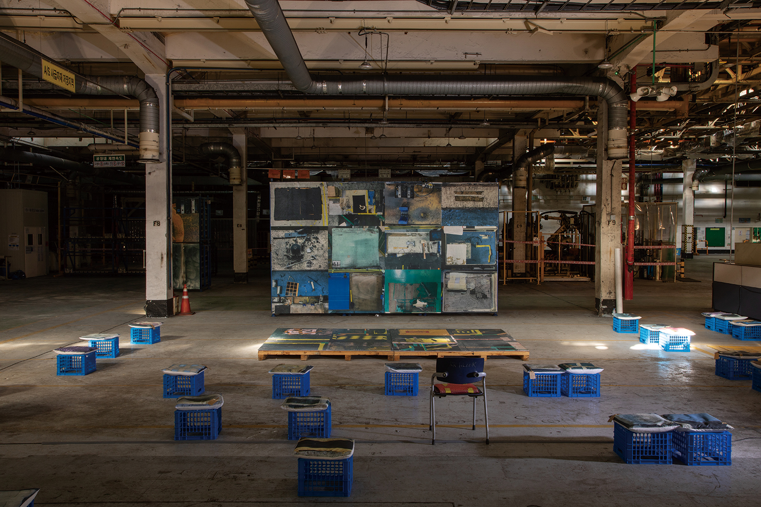 ±è: Àü½Ã¿¡¼ °ø°£ °æÇèÀÇ Á߿伺À» ¡´¼Ò»ç°ø´Ü¡µ ¶§ ´À²¼´Ù. ´ç½Ã ¾²·¹±â ¼Ò°¢ÀåÀ̾ú´ø Àü½ÃÀå(¾ÆÆ®º¡Ä¿)ÀÇ ³»·ÂÀ» °í·ÁÇØ ¿ì¸®°¡ ¼öÁýÇÑ ¹«¿ëÇÑ ¾²·¹±âµéÀ» ÆîÃijõÀÚ´Â ±âȹÀ̾ú´Ù. °Å´ëÇÑ °øÀå°ú ±â°è¿¡ ½×ÀÎ ±â¸§¶§¿Í ¸ÕÁö¸¦ Źº»ÇØ ½Ç¹° Å©±â·Î Àü½ÃÇϰí, ³ëµ¿ÀÚµéÀÌ »ç¿ëÇÏ´ø ¾ÈÀü¸ð¿Í ÀÛ¾÷º¹, Àåºñ, ÀÛ¾÷ ÀÏÁö, »çº¸, ¼³°èµµ¸é, ¼·ù µîÀ» °¡Á®¿Ô´Ù. Àü½ÃÀÇ ¹°¼º°ú È帧 ¿ª½Ã ¾²·¹±â°¡ ÀúÀå°í¿¡ µé¾î°¬´Ù°¡ ¼Ò°¢µÇ´Â °øÁ¤¿¡ ¸ÂÃç ±¸¼ºÇß´Ù. Àü½Ã ÄÜÅÙÃ÷¿Í Àü½Ã °ø°£ÀÌ °¨°¢ÀûÀ¸·Î ¿¬°áµÇÀÚ, Àü½ÃÀÇ ³»¿ë°ú ¸Þ½ÃÁö°¡ ´õ ±íÀÌ Àü´ÞµÈ´Ù´Â °ÍÀ» ÇнÀÇß´ø °ÍÀÌ´Ù. Çѱ¹Áö¿¥ ºÎÆò°øÀåÀº Àüü ±Ô¸ð(30¸¸ Æò)µµ ´Ù¸£Áö¸¸ ½Ã¼³ÀÌ Æó±âµÈ °ÍÀÌ ¾Æ´Ï¶ó ¡®¸ØÃᡯ °ø°£À̶õ Á¡¿¡¼ Å« Â÷À̰¡ ÀÖ¾ú´Ù. ¼Ò»ç°ø´Ü°ú »ï¾çÁß±âÀÇ ½Çü°¡ Àü½Ã¿¡¼ »ç¶óÁø À¯·É°ú °°¾Ò´Ù¸é ºÎÆò2°øÀåÀº Ȱµ¿À» Àá½Ã ¸ØÃá, ÇöÁ¸ÇÏ´Â ´ë»óÀ̾ú´Ù. ±×·¡¼ óÀ½ºÎÅÍ ´ÝÈù °øÀåÀÇ ¹®À» ¿°í ±× ¾È¿¡¼ Àü½ÃÇÏ´Â °ÍÀÌ ¿ì¸®ÀÇ Áß¿äÇÑ ¸ñÇ¥¿´´Ù. ÇкΠ¶§ °ÇÃàÀ» Àü°øÇÑ Å¿ÀÎÁö, Àü½Ã °ø°£À» ±¸È¹ÇÏ°í µ¿¼±À» °èȹÇÏ´Â °úÁ¤ÀÌ ½ÃÄö½º¿¡ µû¶ó °ø°£ °æÇèÀ» ¼³°èÇÏ´Â °ÇÃà°ú ºñ½ÁÇÏ´Ù´Â »ý°¢ÀÌ µé±âµµ Çß´Ù. Àü½Ã°¡ ´ä»ç³ª °ø¿¬Ã³·³ ´Ù°¡¿Â °ü°´µéµµ ÀÖÀ» °ÍÀÌ´Ù. Åõ¾î¸¦ ¾È³»ÇÏ´Â ÀÛ°¡ÀÎ ¿ì¸®µéÀÌ ÇØ¼³ÀÚ³ª º¯»ç °°Àº ¿ªÇÒÀ» ÇÏ´Â °Å´Ù. °øÀå ¾È¿¡¼µµ ¹«´ëó·³ º¸¿©ÁÙ °÷¿¡¸¸ Á¶¸íÀ» ÄѰí Á¶µµ¸¦ ³·Ãß´Â µî µ¿¼± ¾È¿¡ ÀÖ´Â ¸ðµç ȯ°æµéÀÌ Ã¶ÀúÈ÷ °èȹµÈ ÀåÄ¡µéÀ̾ú´Ù. ºó °øÀåÀÇ ¸ð½ÀÀ» ÃÔ¿µÇÑ »çÁø(¿À¼®±Ù), ÄÁº£ÀÌ¾î º§Æ®¿¡¼ ³ëµ¿ÀÚµéÀÌ ÀÏÇÏ´Â µÞ¸ð½ÀÀ» ´ãÀº µå·ÎÀ×(±èÀºÈñ), ºÎÆò2°øÀå¿¡¼ ¸¶Áö¸·À¸·Î »ý»êµÈ Æ®·¢½º Â÷·®À» Á¤ºñ ¸¶½ºÅ͵éÀÌ ºÐÇØÇÏ´Â ¿µ»ó°ú ÇÔ²² ºÎǰÀ» °è¿º°·Î Àç¹èÄ¡ÇÑ ¼³Ä¡ÀÛ(±èÀºÈñ, ÃÖÇõ±Ô ±âȹ¡¤¿¬Ãâ), Â÷ü°øÀå ³ëµ¿ÀÚµéÀÇ ÇϷ縦 »ó»óÇϸç À̵éÀÇ ¼Ó¸¶À½À» Ç¥ÇöÇÑ ¼³Ä¡ÀÛ(¾çÁ¤¿í), ³ëµ¿ °úÁ¤¿¡¼ »óóÀÔÀº ½Åü¸¦ ÃÔ¿µÇÑ »çÁø ¿¬ÀÛ(¿À¼®±Ù), ³ëµ¿ÀÇ ÇǷθ¦ ´ú±â À§ÇØ ±Ã¿©ÁöÃ¥À¸·Î ¸¸µç ÀÇÀÚµéÀ» ¹æ¼® ÇüÅ·ΠÀçÇöÇÑ ¼³Ä¡ÀÛ(¹Î¿î±â)±îÁö. Àü½ÃµÈ ÀÛ¾÷µéÀº ½º½º·Î¸¦ µå·¯³»±âº¸´Ù °øÀå¿¡¼ »ç¶óÁø Á¸ÀçµéÀÇ À̸§À» È£¸íÇϰí ȯ±âÇÑ´Ù.