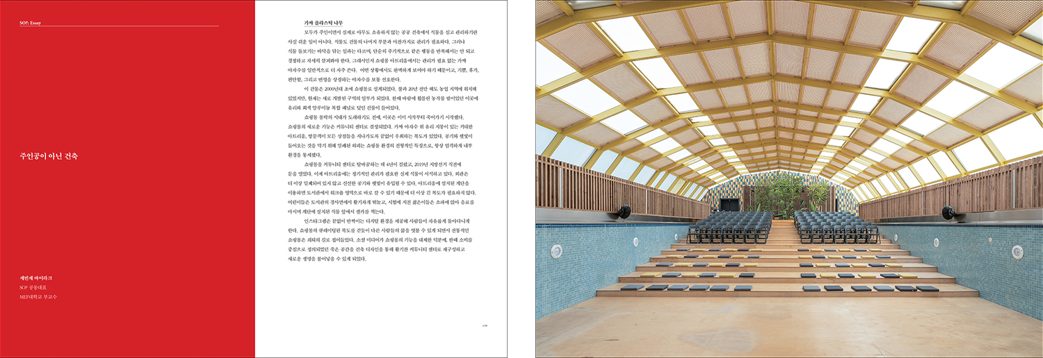 ¡°Æ¯È÷ ¼ö¿µÀåÀÇ Å¸ÀÏÀ» ±×´ë·Î »ç¿ëÇß´Ù´Â Á¡Àº »ó¡ÀûÀÌ´Ù. ÇüÅÂ¿Í ±¸Á¶¸¦ ÀçȰ¿ëÇÏ´õ¶óµµ ¸¶°¨Àç Á¤µµ´Â ±³Ã¼ÇÒ ¼öµµ ÀÖ¾úÀ» °ÍÀÌ´Ù. ±×·¯³ª ÀÌ ÇÁ·ÎÁ§Æ®¿¡¼ °ÇÃà°¡µéÀº ÀÌ ¼ö¿µÀåÀÌ ÇѶ§ ¼Ò¼ö¸¦ À§ÇÑ ¼ö¿µÀåÀ̾ú´ø »ç½ÇÀ» ÀǵµÀûÀ¸·Î ³²±ä °Í °°´Ù. °ú°ÅÀÇ ½Ã°¢Àû ÀλóÀ» À¯ÁöÇÔÀ¸·Î½á, °ÇÃàÀº ¡®»çÀûÀ¸·Î Á¡À¯µÈ Á¤Ä¡Àû dz°æ¡¯ÀÇ ¿ª»ç¸¦ ȯ±â½ÃŰ´Â ÀåÄ¡°¡ µÈ´Ù.¡±